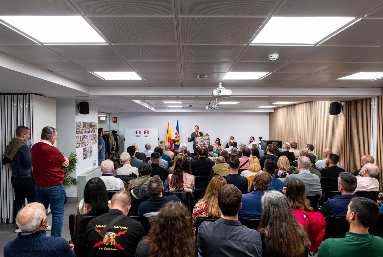 Pedro Chaparro, Presidente de DN, realizó un discurso explicando cómo en esta democracia no hay solución alguna, habló de las corruptas democracias occidentales que gobiernan y la alternativa posible para revertir la crisis y destrucción a causa de las políticas de reemplazo étnico y cultural. Chaparro analizó el momento institucional actual, planteando reflexiones sobre participación ciudadana, la representación parlamentaria, las reformas legales y la falta de calidad democrática y finalizó con un vibrante discurso combativo.